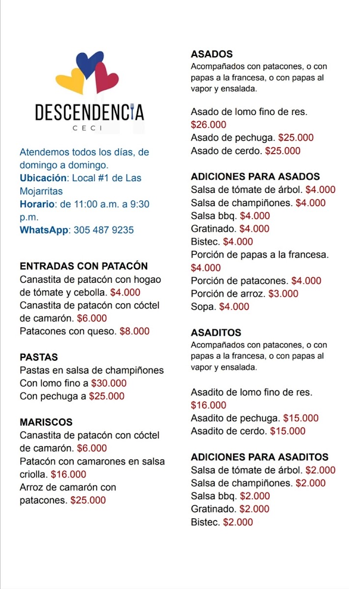 DESCENDENCIA CECI, nestled in Magangué, Bolívar, offers a comforting taste of Colombian home cooking. The menu shines with its Asaditos — tender grilled meats including fine beef loin, chicken breast, and pork, each served with crispy patacones, golden fries, or steamed potatoes plus fresh salad. These hearty plates are elevated by add-ons like creamy mushroom sauce, tangy tree tomato salsa, or smoky BBQ sauce, delivering layers of flavor that feel crafted with care.